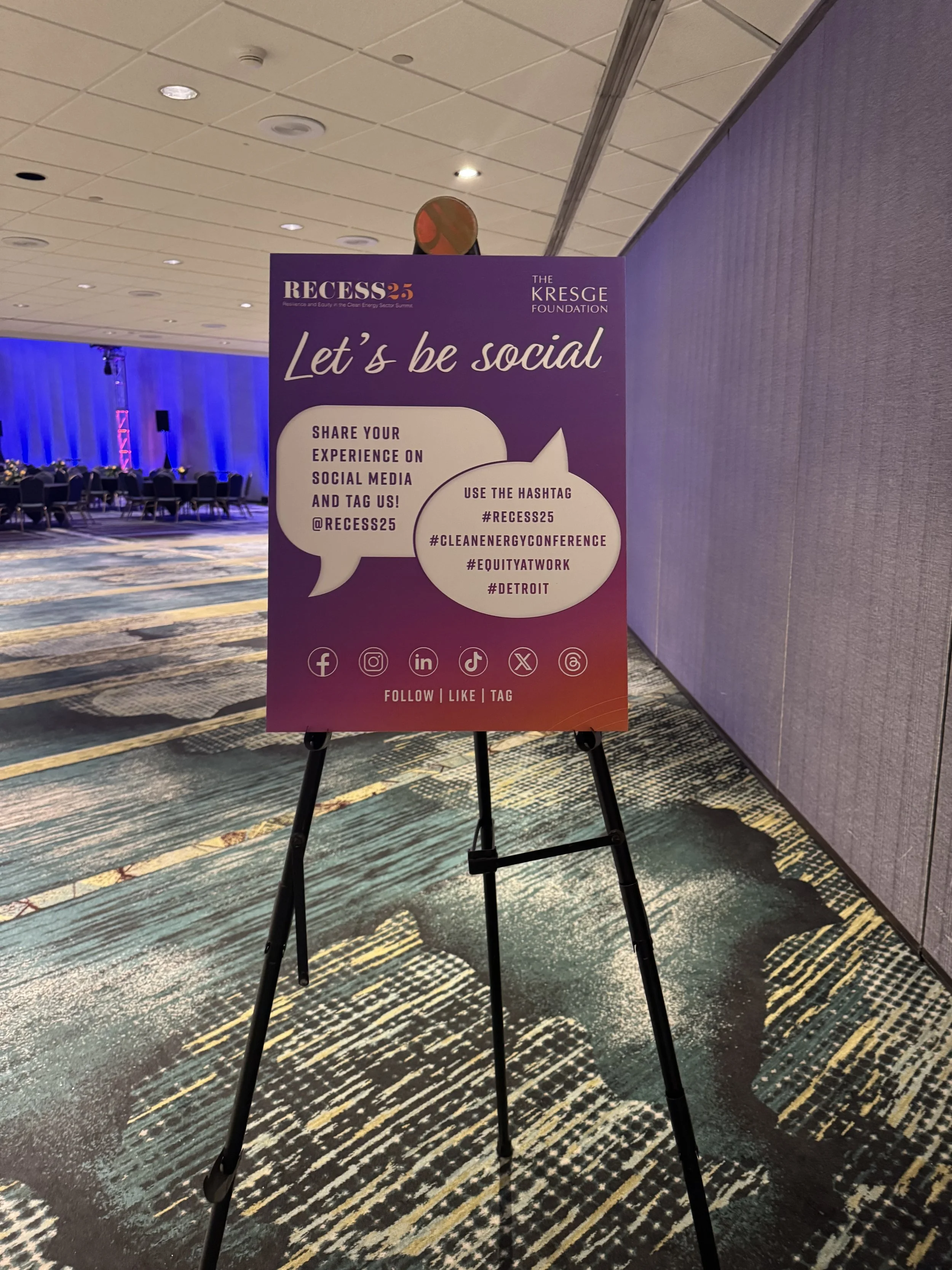 Created a cohesive set of tabletop displays that extended the RECESS25 visual identity into the physical event space. The designs integrated brand color gradients and social engagement prompts, connecting print materials with digital platforms through QR codes and social media integration.